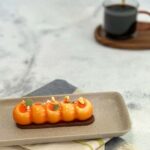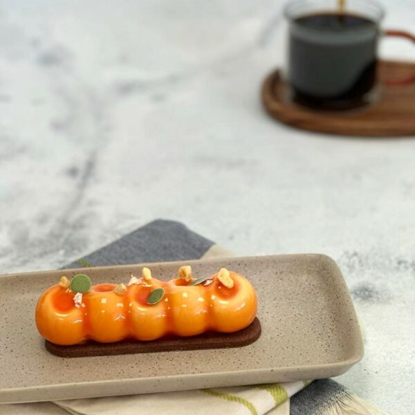 Mousse de Naranja y Menta, centro de confitura y gel de naranja con base de sable de cacao