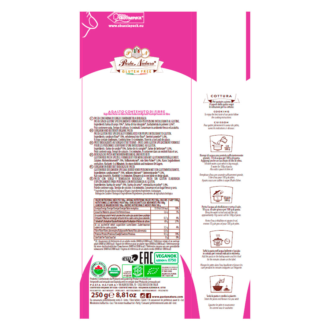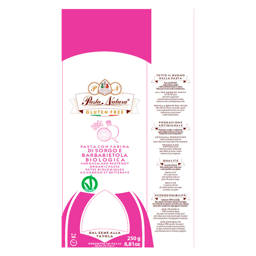 250 grEl Sorgo es un grano antiguo con notables propiedades nutricionales. PASTA NATURA lo presenta mezclado con Betarraga, un superalimento rico en sabor, color y propiedades nutricionales. Ese es el origen de la pasta de sorgo y betarraga, bonita, colorida, fragante… lista para ser la protagonista en tu mesa. Naturalmente libre de gluten, puede ser la base para sus recetas vegetarianas y veganas.
